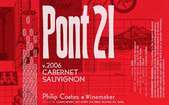 The fine folks at Tacoma’s Coates Winery are releasing their 2006 Pont 21 Cabernet Sauvignon this afternoon at the winery. Label designed by Lance Kagey of Beautiful Angle fame. We’re fans.