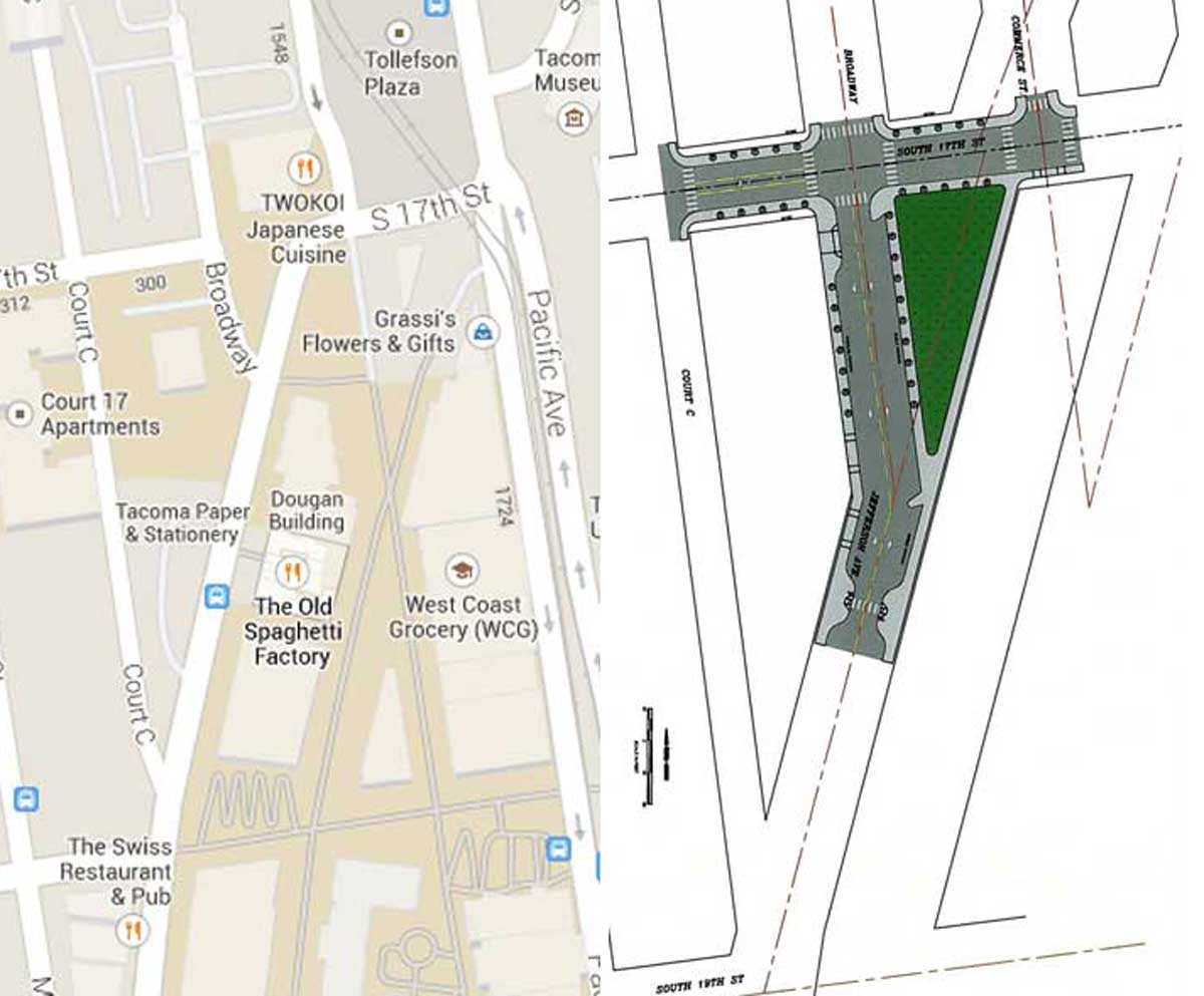 As it is now, 17th is interrupted by that little sloping lawn next to Twokoi (see map at left). The map included with the interagency agreement shows 17th running right through that slope, with a squared-off green space on the UWT corner of the new 17th and Broadway intersection.