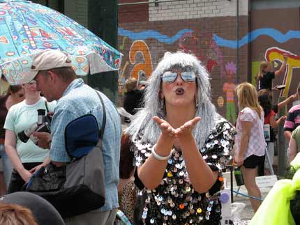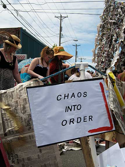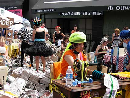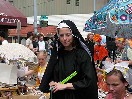 I was lucky enough to make it out to Sixth Avenue today and check out the scene at Art On The Ave. It was packed. The food smelled good. The dogs were friendly. The weather was perfect. The music was great. “Chaos Into Order” was quite the event with sewing machines humming away, various performances, speeches, and songs at the mic, and a tower of paper rising on the street. On the other hand, I was scolded by a nun for various unmentionable city activities she somehow knew about…