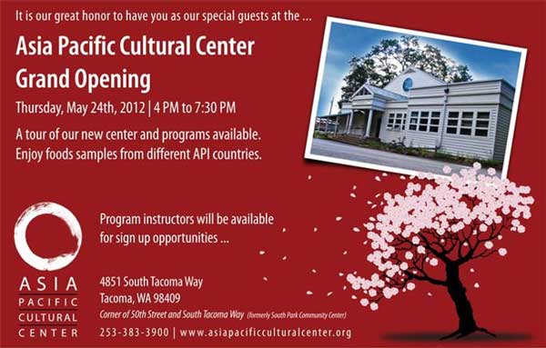 The Asia Pacific Cultural Center has a new home, and they’re excited to share it with you. The APCC has taken over the old South Park Community Center space on South Tacoma Way, leasing the space from Metro Parks. Next Thursday, May 24th, they will be throwing open the doors to the public for tours, food samples from API countries, and to meet instructors from their many programs.