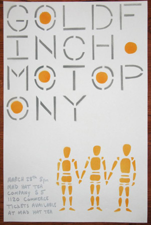 Each has continued to mature as writers, and as performers. Together, they began carefully creating shows that reflected their artistic standards of beauty; hand stenciled posters, intensely local promotion, and carefully selected line-ups. Their fan base has begun to grow beyond their loyal friends and family into the larger community. They try to make Goldfinch events creative and unique, as though each performance could be the last, doing what they can to grow the community and not just themselves.