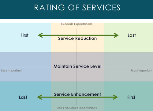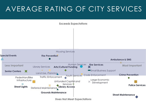 To visualize the spread of expectations and importance, staff created a visual that plots importance of services on the x-axis, and satisfaction with services on the y-axis. Items falling in the upper left range of the graph would be those rated as highly satisfactory, with low importance, making them candidates for cuts. Items falling in the lower right quadrant would be those rated as highly important, but with low satisfaction, making them candidates for increased investment.