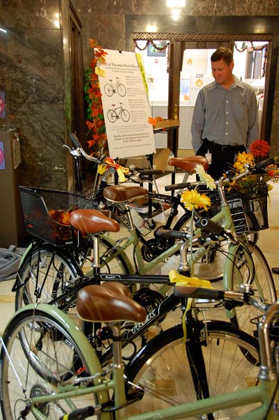 The City of Tacoma launched its fleet bicycle program with a little show-n-tell at City Hall this morning. The four Trek Allant bicycles look great with their racks, baskets, bike bells, and comfortable seats. They are available to City employees during the regular work day as a means to get to nearby meetings or simply for a quick ride.