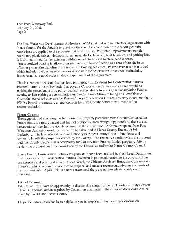 I truly believe if we were not talking about a museum for children that the citizens of Tacoma would be outraged at the underhanded, behind the scene tactics that have taken place to quite honestly steal land from it’s intended use. To paraphrase what Councilman Lonergan said during Tuesday’s study session: if the board of Children’s Museum went to Thea’s Landing and told them they were going to take that land, and develop it into a children’s museum that would not be acceptable. But since the museum wants to develop open land that APPEARS to be unused, it would be acceptable just because there is no building upon it.