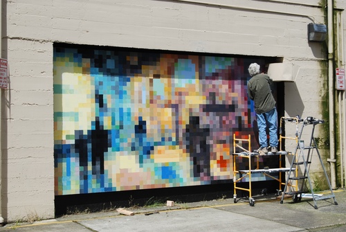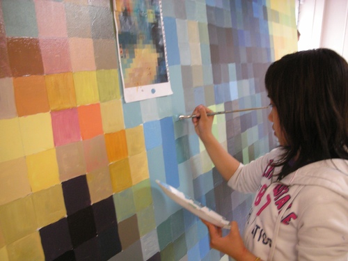 They are 32 feet of 3 by 3 inch squares, each painted in a subtly different hue. (Did you catch that equation? That’s 1,024 squares. Shudder.) They are the product of more than 40 hours of work by 17 sixth- and seventh- graders from Seabury School, Seattle muralist Jose Orantes, two teachers and myself. They are NOT a throw-back to the mid-90s Magic Eye craze. They are much more attractive than the previous view from my desk. And they are most definitely a picture of something.