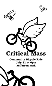 We’ve been reminded by several folks that July’s Critical Mass bicycle ride is tonight. The ride begins at North 9th and Madison Street – on the north side of Jefferson Park – at 6:00 pm. What is it? A bike ride. A bit of bicycle activism. Tacoma’s bicycle scene is finally growing and this ride seems to be part of that growth.