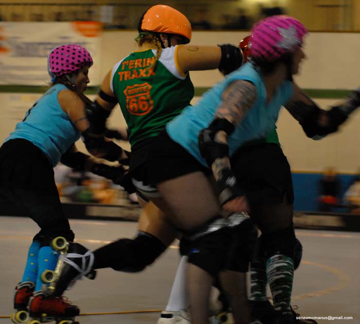 Rachel Moreshead, a member of my Tacoma family and owner of the Blackwater Café has recently been accepted to the Femme Fiannas, one of four teams that belong to the Dockyard Derby Dames: Tacoma’s own all-girl Roller Derby Club. This last Saturday I went to the indoor soccer center to watch Rachel skate and found Tacoma’s new pastime.