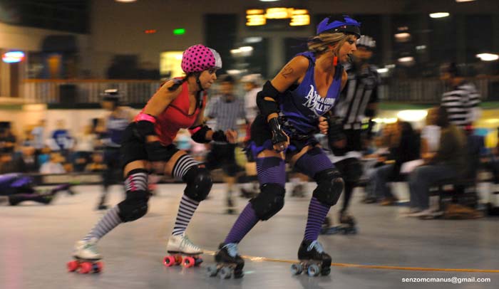 The soccer center had been taken over by some sort of rock demon. There was an extremely loud band playing in the corner when we walked in and even though the match didn’t start till seven, there was little to no seating around the temporary rink. We stood around for a bit and waited for the match to start, and I ran into all sorts of folks I know. (Why has everyone been hiding this from me?) Then the girls came out, all four teams at once, to warm up before the bout. One part glam-rock, one part cheerleader, one part Mike Tyson, and three parts razor blade up your sleeves, this was a mess of the most spectacular display of feminine prowess I have seen since I watched Barbarella Queen of The Galaxy when I was seven. I think the trick is to get there at six when the doors open, bring a lawn chair and set it up rink side. Chances are someone will get slide tackled into your lap. WOOT!