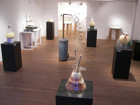 I went to both the opening and the “artist lecture” at the Helm, the latter being this last Saturday. It was colder than the gaze of the Green River Killer, so the turnout was a little sparse. Even Joey was M.I.A. but Eli took the Helm (heh) and explained the exhibition to us with the sense and adorable calm of a Western State Mental Hospital orderly. The front half of the gallery was basically a basement laboratory, buckets and thermostats, glass vats full of fermenting peaches, hoses, beakers, heaters, drippings, and a stack of plastic cups to try the “peach wine”.