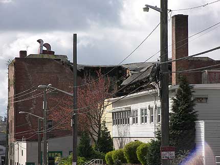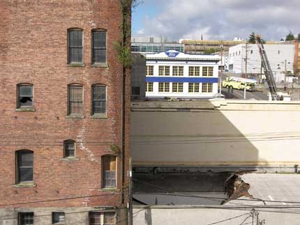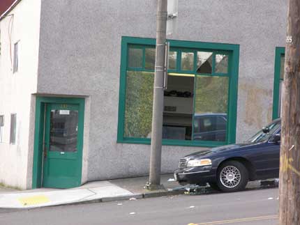 The last photo shows the broken glass at the Piledriver Local office situated just below the Eagles Building. Notice how the glass is in the street. The impact of the debris on the roof blew out the windows. That would not have been a fun morning for the folks inside.