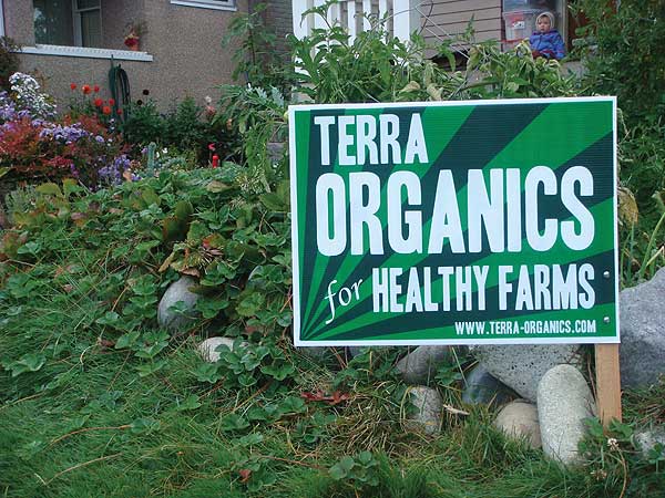 Terra Organics is a family owned company now based in Tacoma that provides home delivery of fresh, seasonal produce while supporting sustainable farms. Their signs have appeared in yards and are occasionally intermixed with the current crop of political candidates. We asked Dan Hulse, the owner of Terra Organics, for a few comments on his non-traditional ad campaign: