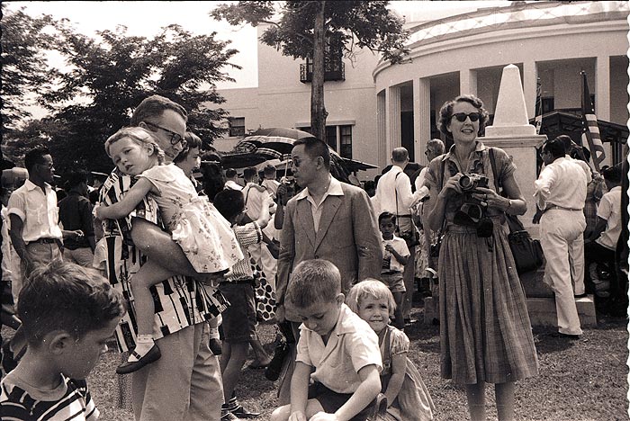 I believe this photo was taken at the American Embassy in Manila when Vice President Nixon visited in 1954 (or so). If you can identify the location or date any more precisely, please tell me.