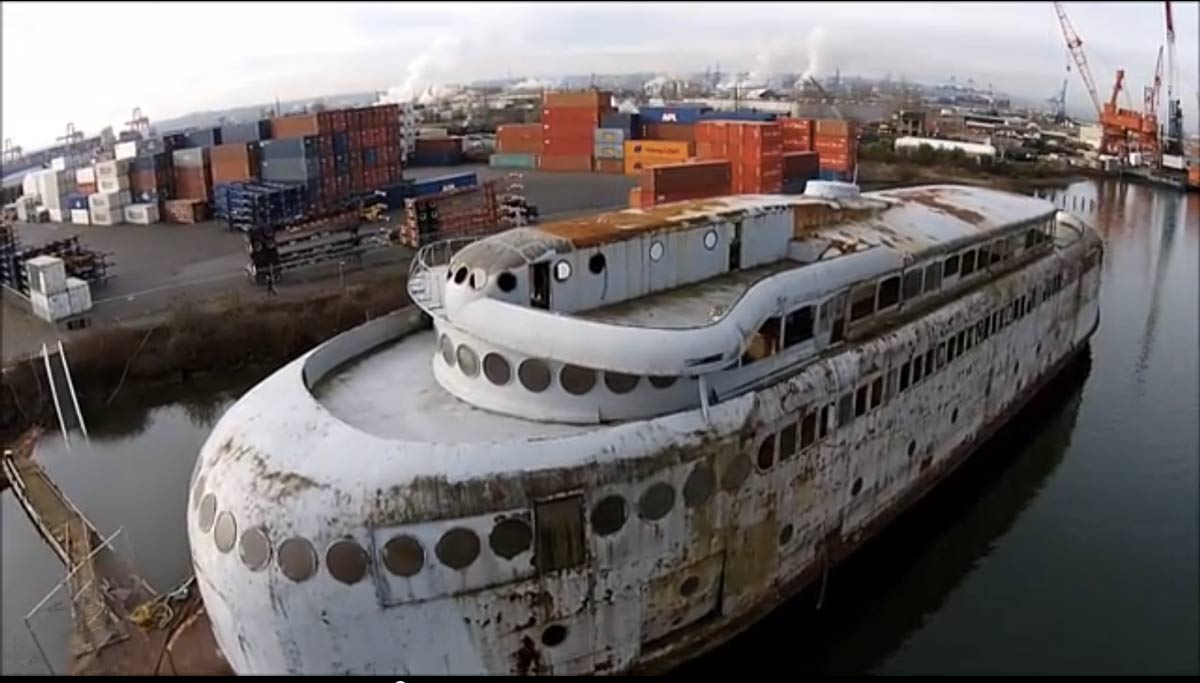 This drone-filmed tribute video isn't quite like seeing the ferry in person, but it gives you a good idea of the Kalakala's contidion in her final days...