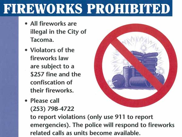 Some of us like to blow things up to celebrate our independence. Some of us, for various reasons (skittish pets, sleeping babies, roof fires, etc) aren’t such big fans of explosions in our neighborhoods. Whatever your feelings on the subject, the fact remains that fireworks are indeed illegal within the City of Tacoma. On that subject, last week’s City Manager’s report had a few notes that might be of interest.