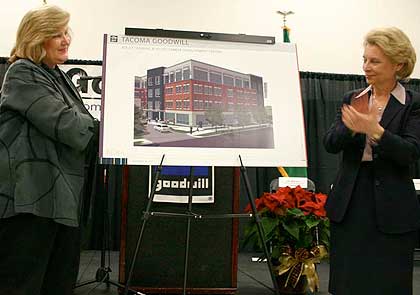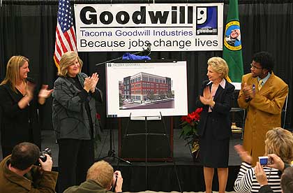 This morning we found ourselves at the Goodwill building on South 27th street for an exciting announcement. After remarks by Jim Walton, Terry Hayes, Goodwill program participants Darren Lewis and Sharon Bryant, and Mayor Bill Baarsma, Governor Chris Gregoire unveiled the new the site plans and design drawings for Goodwill’s new Work Opportunity Center.