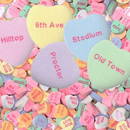 Of course there are a lot more neighborhoods, neighborhood council, and business district names buried somewhere in this pile of sweetness. Nobody’s been left out of our candy heart world.