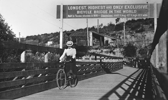 Description: Around 1900, a young woman was photographed riding her bicycle across Tacoma’s bicycle bridge. The bridge was constructed in 1896 near Holy Rosary, connecting Delin Street with the path leading to the Hood Street reservoir. For more than 25 years, it was the “longest, highest and only exclusive” bicycle bridge in the world. The narrow wooden bridge was perched on steel poles high above the gulch and provided a way for bicyclists to cross the ravine. The bridge measured in at 440 feet long, 127 feet high and 12 feet wide and was build with funds accrued from the sale of bicycle licenses. (TNT 9/5/1922- in clipping file) TPL-4459