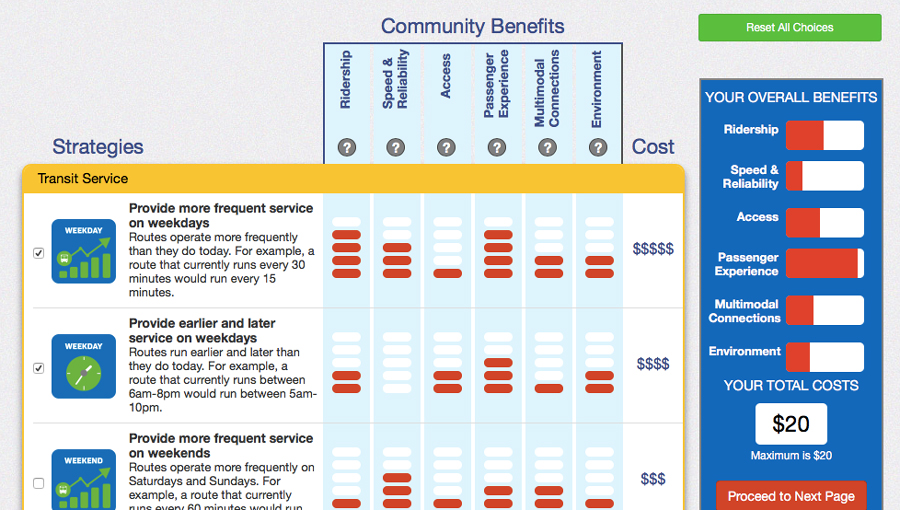 Each improvement is weighted for how much of the $20 budget it would cost. Each also indicates the impact it would have in various benefit categories, including ridership, speed and reliability, access, passenger experience, multimodal connections, and environmental impacts. A cost/benefit calculator reflects selections made, totaling the cost, and indicating the benefits on sliding scales.