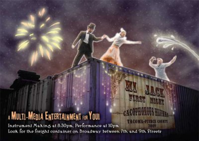 WHEN: HI JACK: From 8:30pm until 10 pm on December 31st, the community is invited to create musical instruments using recycled plastic vessels, tin cans, sticks and gravel- which we will provide. At 10 pm a live performance will include a dancing duo, a railroad barker, a freight container, recorded music, costumed actors and a giant puppet springing from a jack-in-the-box if the drumming audience makes enough noise (music). 2009 mystery objects will be launched at the finale, providing souvenirs for spectators.