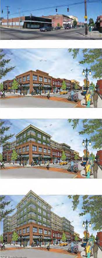 The plan identifies several potential future catalyst projects with redevelopment potential, including the Browne's Star Grill/Pochert Building and the vacant lots at the corner of 11th and MLK, among others. A series of renderings of possible full, fuller, and fullest build-out of the intersection at MLK and Ernest S Brazill provide some interesting food for thought on the future of the neighborhood.
