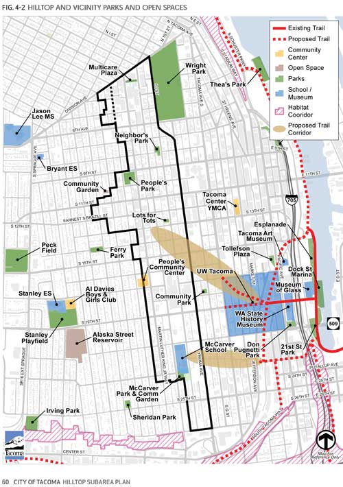 - Complete Streets - This ties in to the idea of promoting multi-modal transportation options, including making bike and pedestrian commuting a viable option. A map of existing and proposed open spaces shows a couple of interesting potential "green pedestrian connections," one continuing the UWT hillclimb up and at an angle into the heart of the Hilltop Business District, and another connecting the Brewery District to MLK, possibly via South 23rd.