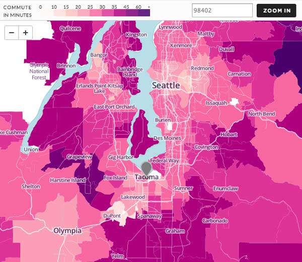 Type in your zipcode, or just scroll around the map to see how your neighborhood compares to nearby zipcodes, or other parts of the country. Our unscientific analysis of our surrounding Tacoma neighborhoods show commute times between 24 and 26 minutes. According to Marketplace, the average commute time in the US is about 30 minutes.
