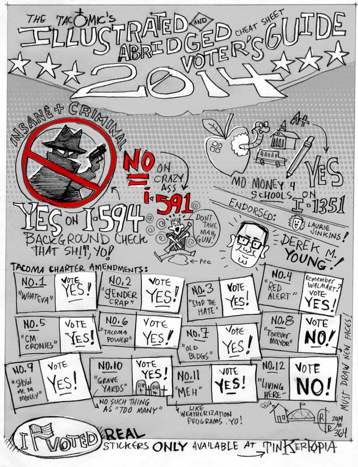 On Wednesday the Tacomic came out with its own more creatively rendered endorsements, with key phrases to help you remember them: No on 8 ("forever mayor") and 12 ("living here"), yes on the rest. The Tacomic also offers opinions on a couple of local candidates, and some of the controversial state-level initiatives (pictured above, and with commentary at Feed Tacoma).