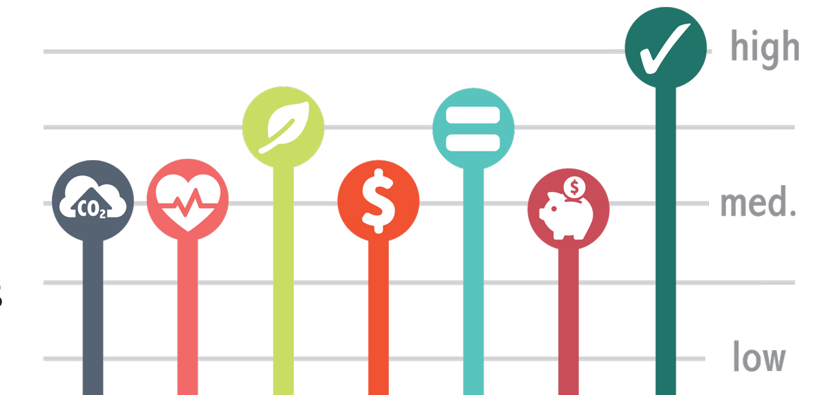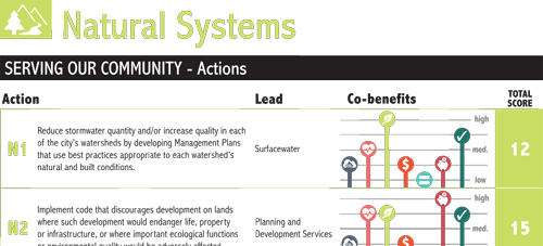 The intention is to take all the goals and strategies from the various plans, and begin to move coherently toward measurable accomplishments. To this end, within each of six categories, the plan identifies things the City can do - both in terms of services and policies, and in leading by example. The plan identifies a list of more than 60 potential early actions that the City could begin to tackle between now and 2018. The actions are categorized by system affected, rated for benefits produced, and scored for citizen interest, based on public input gathered late last year.