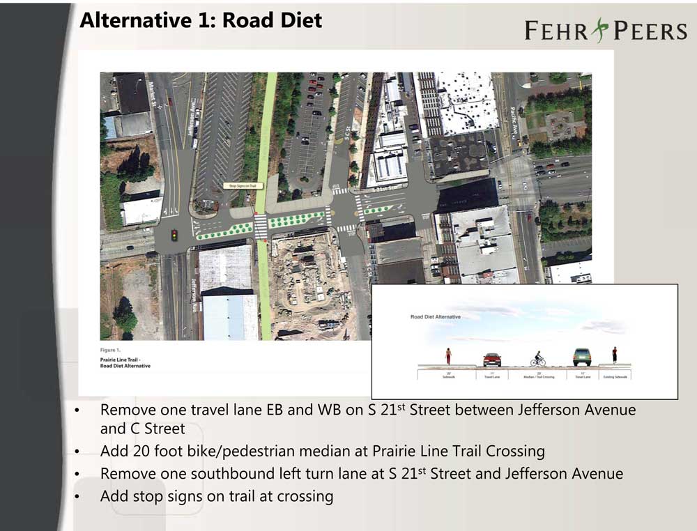 The Prairie Line Trail intersects 21st Street mid-block, mid-slope, just downhill from the existing Jefferson Street traffic signal on the busy 21st Street approach to Pacific Avenue and I-705 freeway entrances. A location like that presents a challenge in creating a crossing that is safe and functional for both drivers and bicyclists/pedestrians. The City has been working with a consultant to come up with options, and on May 14, they presented their top three to the Chamber.