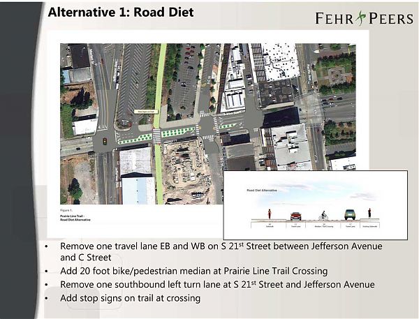 Alternative 1: Road Diet – This option would shrink 21st Street, removing one lane of travel in the block between Jefferson and C Street. A bike/pedestrian crossing would be added to allow the Prairie Line Trail to continue straight across 21st without diversion.
