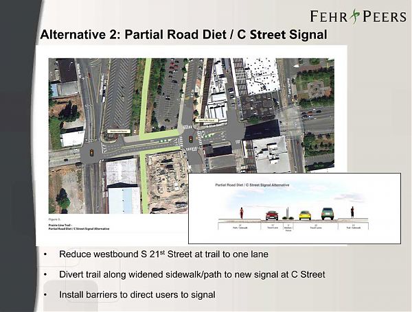 Alternative 2: Partial Road Diet / C Street Signal – This option would divert the Prairie Line Trail to a new signal at C Street. Prairie Line Trail traffic would be diverted along newly widened sidewalks/paths on either side of 21st Street. 21st would be slightly narrowed in this section.