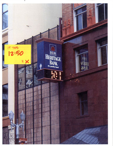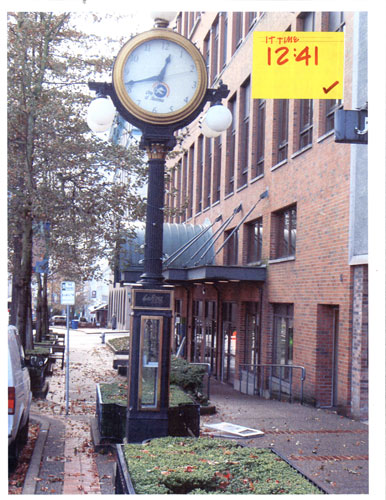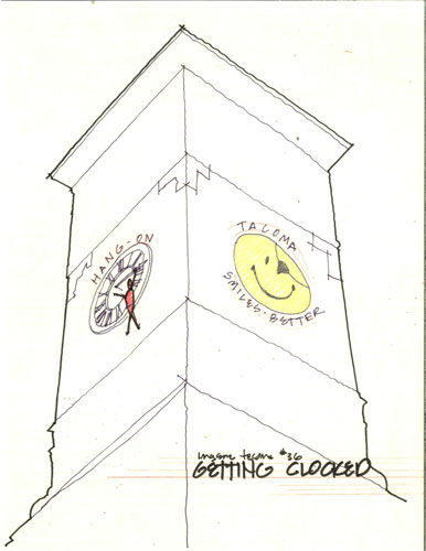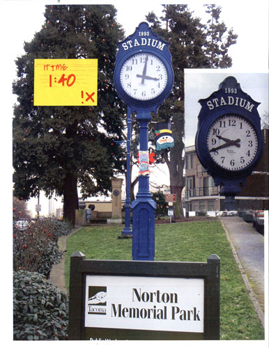 With the big time countdown this week, what civic clock would you use to ring in the New Year? It seems that downtown Tacoma has a good quantity of timepieces – but what a community embarrassment for those clocks that are so prominent and yet so broken. A quick walk-about in the core found at least ½ the clocks surveyed to be inoperable or unintelligible. So imagine if errant clocks were policed and ticketed to make sure they are at least ‘close’ to be reasonably trustworthy? And if not repaired in a timely manner, the clocks are handed over to the local artists to create their own time pieces?