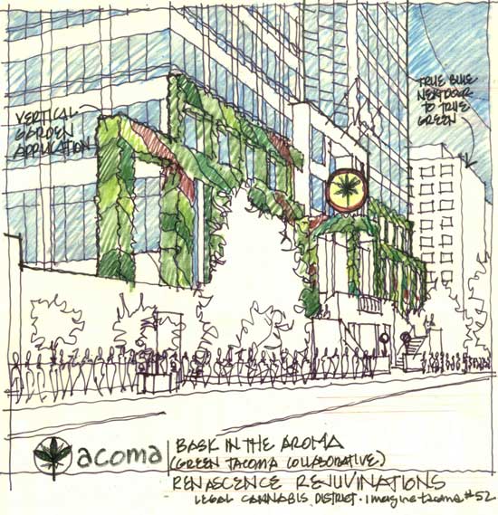 Let Tacoma take the lead as a municipality and develop a Legal Cannabis District (Tacoma loves its little boutique districts). And since Tacoma is weathering the ‘Great Recession’ so far based on the profitability of providing vital TPU services, why not expand into another commodity that could also be directly beneficial to the quality of life for its citizenry? Hey the State of WA does it with alcohol right? And think of the PR possibilities! Rick Steves will be touting this little bit of Europe in the Pacific Northwest on all his travel shows, Woody Harrelson and (name your own Hollywood star/celebrity here) will be making promos for Tacoma, and the Doobie Brothers can be the warm-up act for a Dave Mathews concert at the T-Dome. Maybe a new institute could be developed (to make the healthcare connection) to study the benefits of cannabis in healing and Washington State’s recently approved Death with Dignity Act. And talk about wanting to make Tacoma a true college town! Maybe we can even get the City into a cameo scene of an upcoming ‘Weeds’ (I will offer my services free of charge to tour Ms. Parker around town if need be). Maybe the Arts Commission could commission Patrick Blanc to create another one of his amazing vertical gardens along the front façade? Add some big ventilation blowers out the East side of the building – and we will have just created a new olfactory experience for taking in the ‘Aroma of Tacoma.’