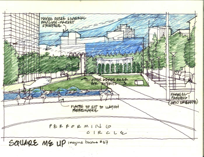 As we enter the long dark wet days of winter, reflect on the warmth of the sunshine, the smell of the flowers, and the taste of the food that is the Tacoma Farmer’s Market. So imagine what a squared-up Pierce Transit Square could offer for our 09’s enjoyment: