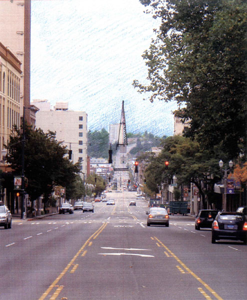 This building falls into the ‘destruction of a vista’ category. The visual terminus of the Pacific Avenue Axis looking to the South should either be a grove of Douglas Firs OR a structure that is symbolic of a community’s aspirations. A number of years ago there was great political interest in creating a Tacoma Spire – an iconic structure with an observation platform to be located next to the Convention Center. Well, what about affixing such an element to the North wall of Pacific Tower?
