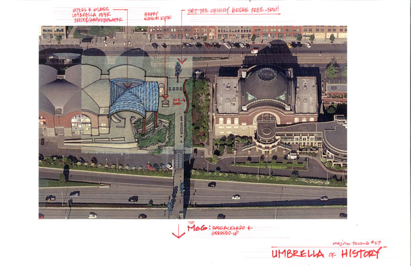 Why not a large glass conservatory umbrella over the History Museum entrance – channel the Seymour Conservatory and New York City’s Winter Garden at Battery Park so to speak. The design architect for the History Museum – Moore/Andersson – envisioned such greenhouses/birdcages for one of the design incantations for the Chihuly Bridge so it would not be that far a stretch to incorporate (and if the design fees alone were tallied for the many bridge studies, the umbrella could probably have been paid for).