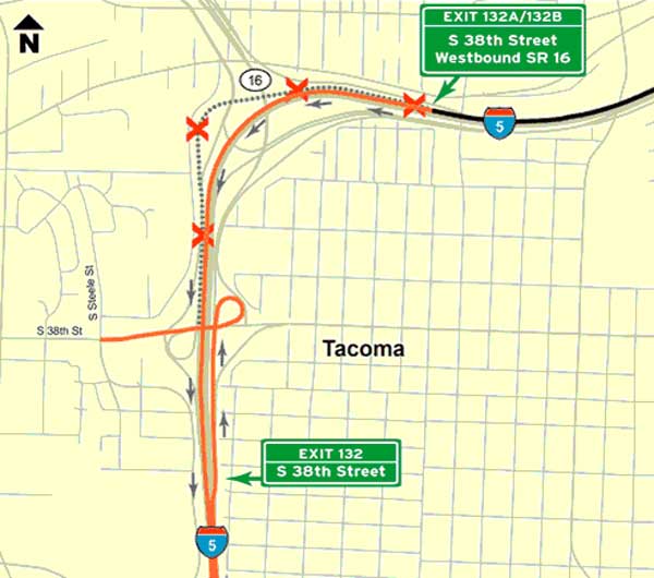 Also closing southbound I-5 exit to westbound SR 16 (Exit #132B). Motorists will be detoured via the South 56th Street interchange.