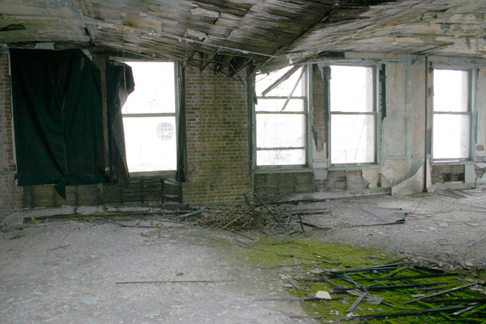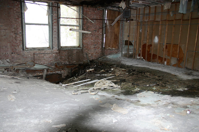 LIEBERMAN: It won’t be land-filled. Most of what is here is wood. It will be taken out and chipped up and burned for electricity or turned into mulch. It’s not landfill-bound. I have posed the question of re-using the wooden floor joists, which are 2’ x 14’. It’s highly questionable how good they are because they have been so damp for so long, especially where they enter the brick.
