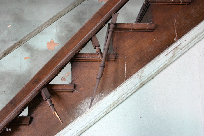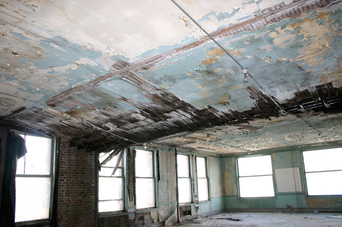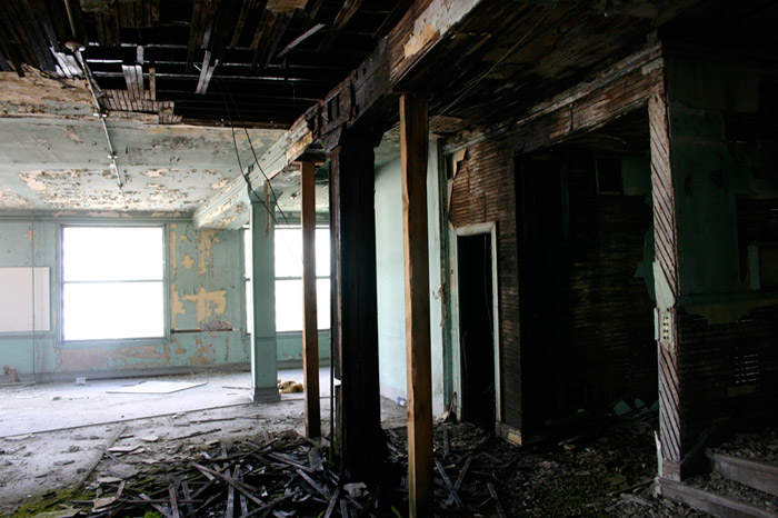 Inside, it was not unlike the “Fight Club” house: paint peeled from most surfaces like skin off a week-old sunburn; holes large enough to crawl through existed in some of the walls; water dripped from too many places to count; and a sheen of dirt covered most windows, affecting a misty glow on most floors. In many areas, floors sank like whirlpools stretching down to the next level. Above us, ceilings comprised of central beams with rib-like planks bowed like giant rib cages.