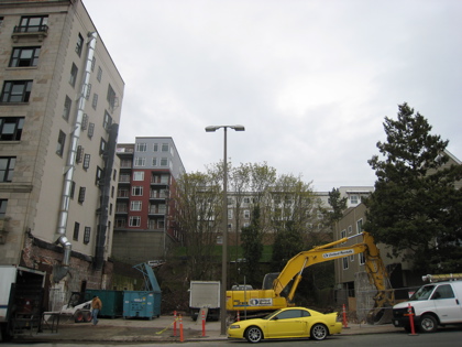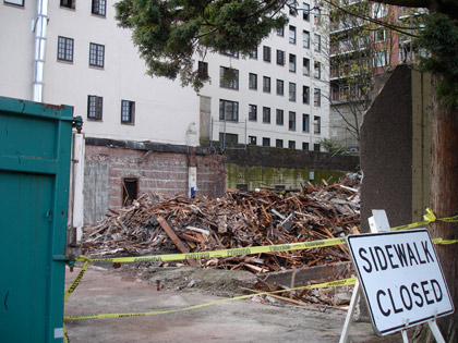 Last Friday demolition began on the single story building adjacent to the Walker Condominiums (see Tacoma Urbanist for early pictures).