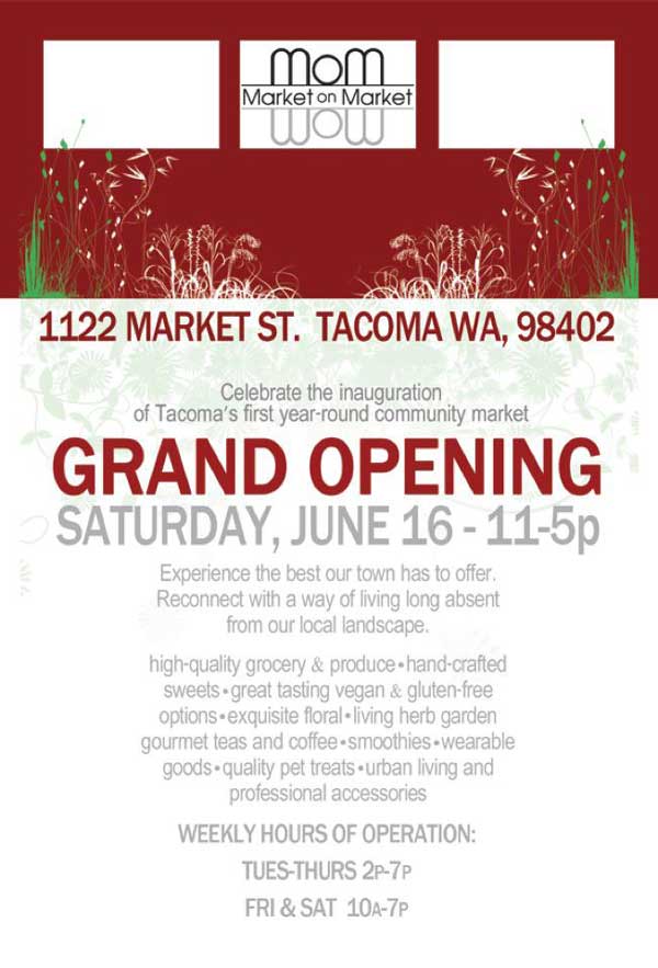 Market on Market “Tacoma’s first year-round community market,” will showcase the goods of local producers, many of whom you’ll recognize from Tacoma’s farmers’ markets. The grand opening flyer invites you to experience the best our town has to offer, and to “Reconnect with a way of living long absent from our local landscape.