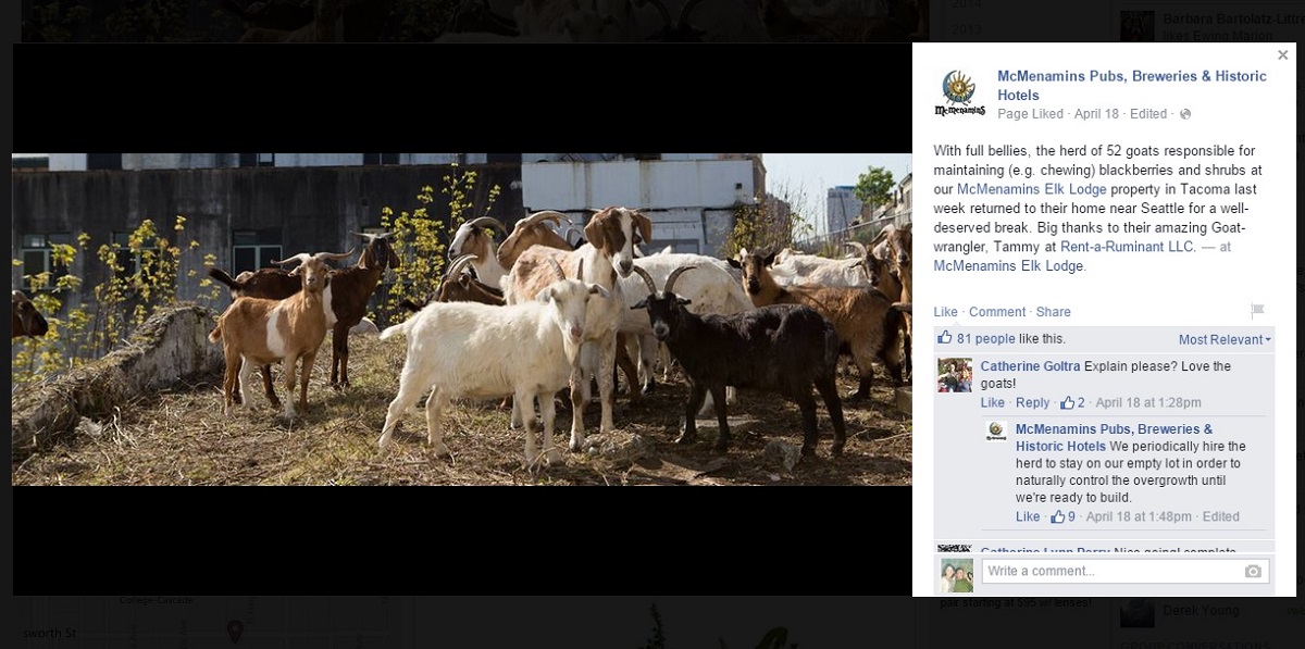 If you visit the McMenamins Pubs Facebook page right now, the cover photo you'll see features a flock (is that the right word?) of goats in front of a familiar looking building. The goats are from Rent-a-Ruminant, and they're featured in a YouTube video explaining how they help with weed control on the slopes next to the historic building.