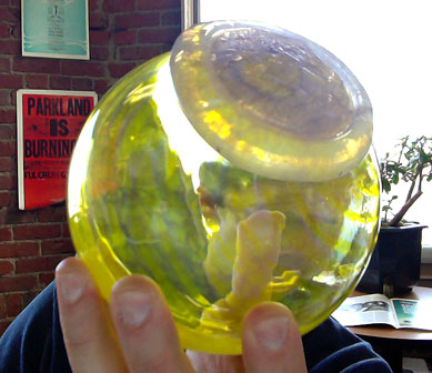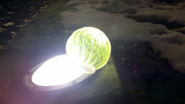Keep looking late night lookers! I did and was rewarded with my first find. I originally stopped my car to look at an orange orb near a tree. After discovering it was an orange I went around the corner and found another orange orb and to my delight it was made of glass. Thanks Monkey Shine makers and supporters for encouraging folks to get out and discover our great city.