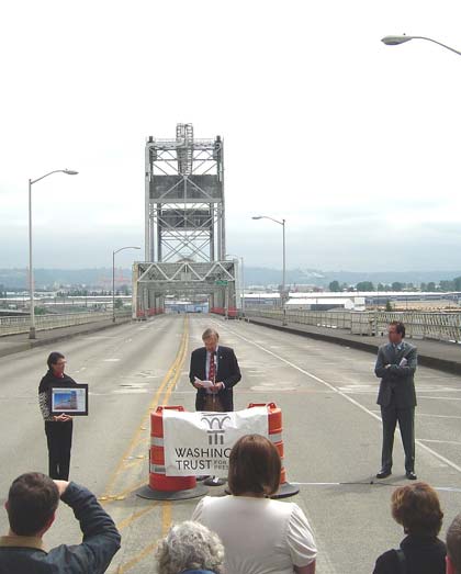 The Washington Trust for Historic Preservation announced their 2008 list of the state’s most endangered historic properties from the western edge of the Murray Morgan Bridge this morning. With Mayor Baarsma, Representative Flannagan, and about 40 friends, officials, and passers-by in attendance, the crowd was quite sympathetic to those that hope to reopen the bridge.