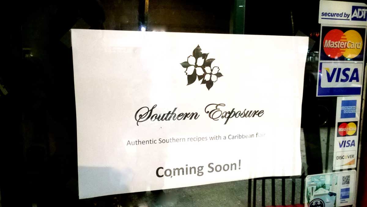 We noticed the "coming soon" sign for Southern Exposure a few weeks ago, but we didn't have many details, other than the "Authentic Southern flavors with a Carribean flair" tagline.