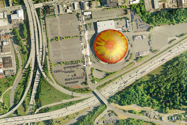 But, according to the TNT, Tacoma Arts Administrator Amy McBride has been exploring the possibility of giving the Warhol treatment to the Dome, possibly the next time the 5-acre blue roof needs replacing. The City still retains the original lithographs submitted with Warhol’s proposal in 1982, and the idea has a lot of support from many Tacomans, who would like to be welcomed home by the sight of an enormous work by a world-famous artist. Even the Andy Warhol Museum in Pittsburgh seems supportive. Without a formal proposal, however, the Warhol Foundation in New York won’t comment, and they’re the ones with the actual rights to the work.