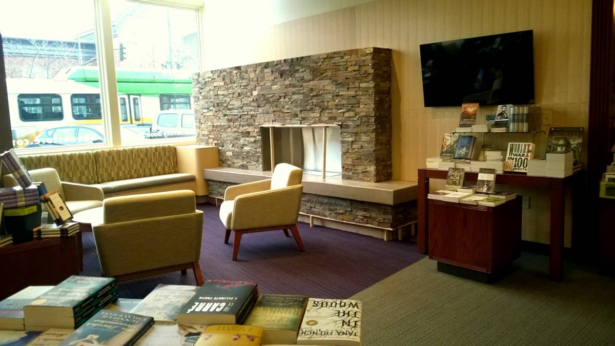 With the grand reopening, visitors will find a new "bookstore/coffee house" vibe that may remind you more of a Barnes & Noble or other comfortable bookstore. The changes come with an open-door policy that welcomes customers to wander over from the neighboring Starbucks. Visitors can browse the books, enjoy comfortable seating, and a newly installed fireplace (not quite up and running just yet, but soon). The new bookstore boasts an events space for book signings, indoor and outdoor seating, new food options, and a big-screen TV.