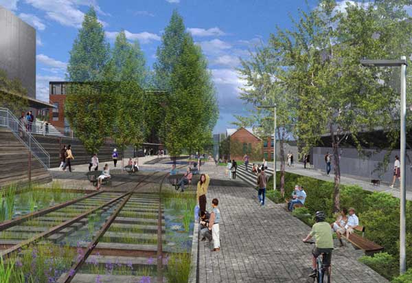 The rails remaining from the train line that gives the trail its name take a prominent place in the design, with plans showing surrounding landscaping and paving brought to their level, but not covering the metal. Rails run through simple concrete pavers, through grass, and through rain gardens.