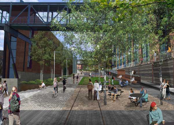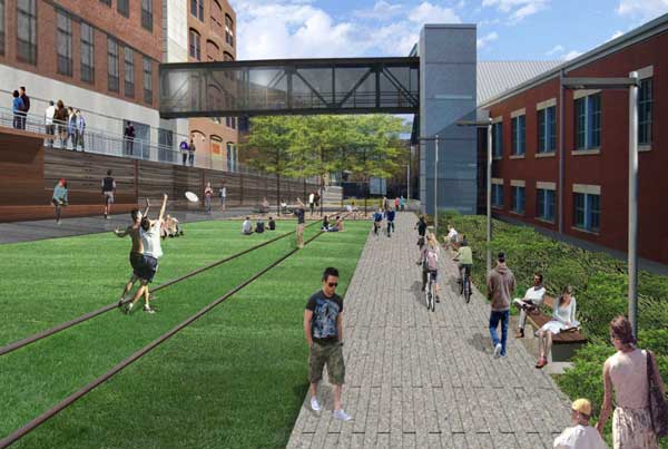 The new design makes changes to improve bicycle access and to better honoring the area’s industrial past and the historical significance of the railroad terminus. The bike corridor looks more like a true corridor, running straight through the space, rather than taking jogs around other design elements.