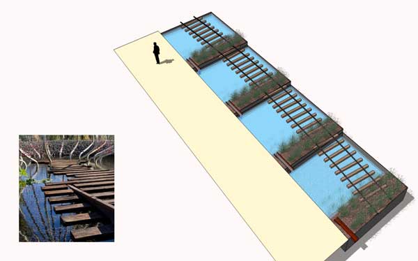 Images from the presentation available on the UWT project page show rails with railroad ties running through a series of rain gardens at various levels of fullness.